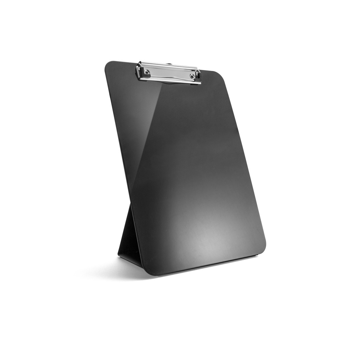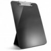 Clipboard holds letter-size and A4-size documents. Low-profile clip has a retractable hang hole and securely holds up to 20 sheets of paper. Easel on the back is sturdy and easy to stand on a desk or any flat surface. Easel provides angle to keep notes in view while typing. Easy to store, folds flat when not in use. Made from 30% recycled plastic.