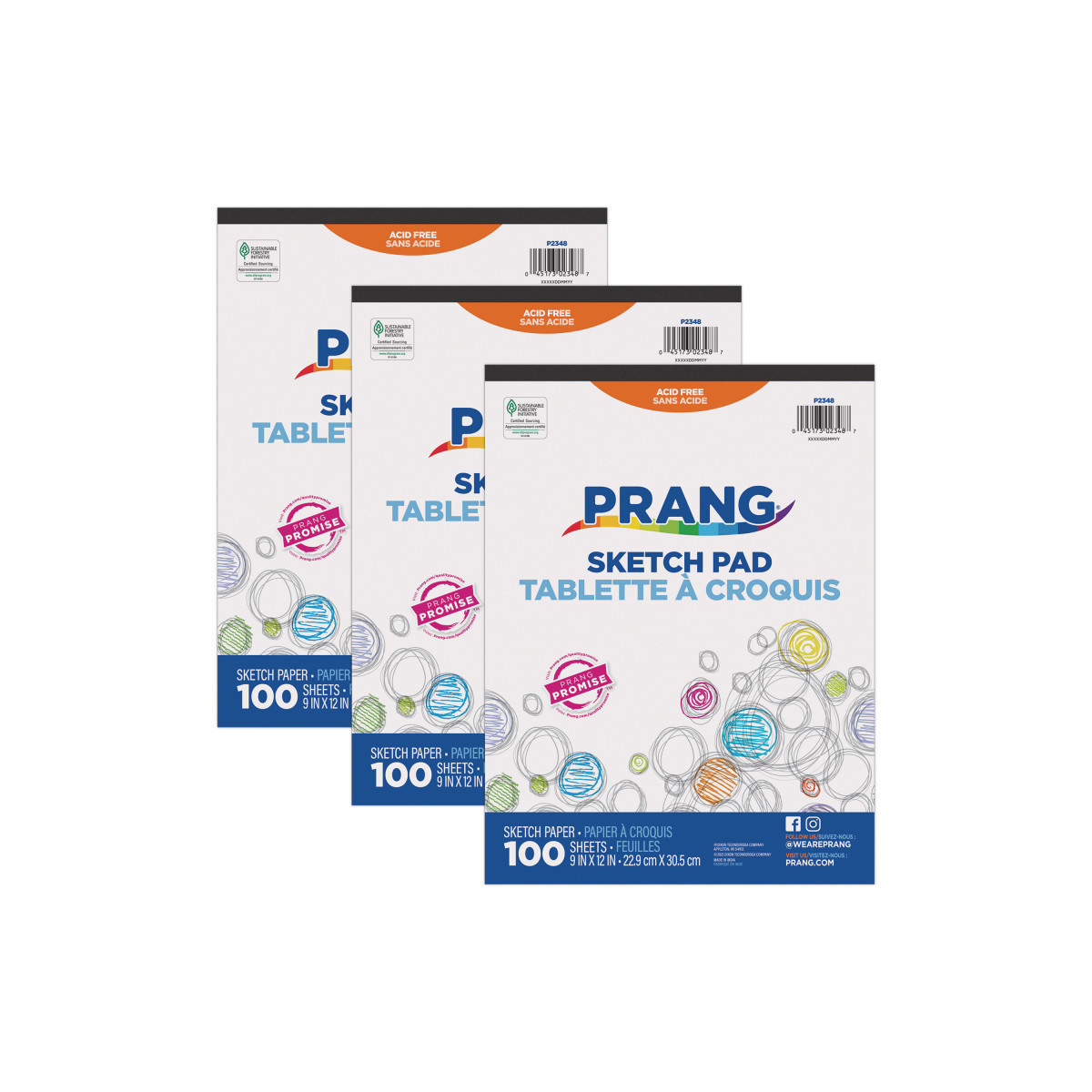 Prang® is great for young artists. This sketch pad contains more sheets than the normal sketch pad making it a great value. Sketch paper inside is perfect for use with dry media. Tape bound with a sturdy chipboard back. Great for pencil, colored pencil, pen or crayon. Acid free and recyclable. Each sketch pad includes 100 sheets of paper. Sold as a pack of 3 sketch pads.