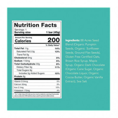 Soft-baked for a chewy texture. This seed and oat bar is perfectly balanced with organic chocolate chips and sprinkled with large flakes of Australian sea salt for that taste of homemade chocolate chip cookies.