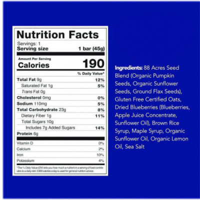 This seed and oat bar is a perfect blend of real food and powerful nutrition, making it your perfect on-the-go snack. Savor the burst of bright lemony tartness paired with sweet blueberries in every bite. Free from the top nine allergens, this bar is nut-free, gluten-free, vegan and kosher. With non-GMO certification and no artificial ingredients, this bar is ready to energize your busy day.