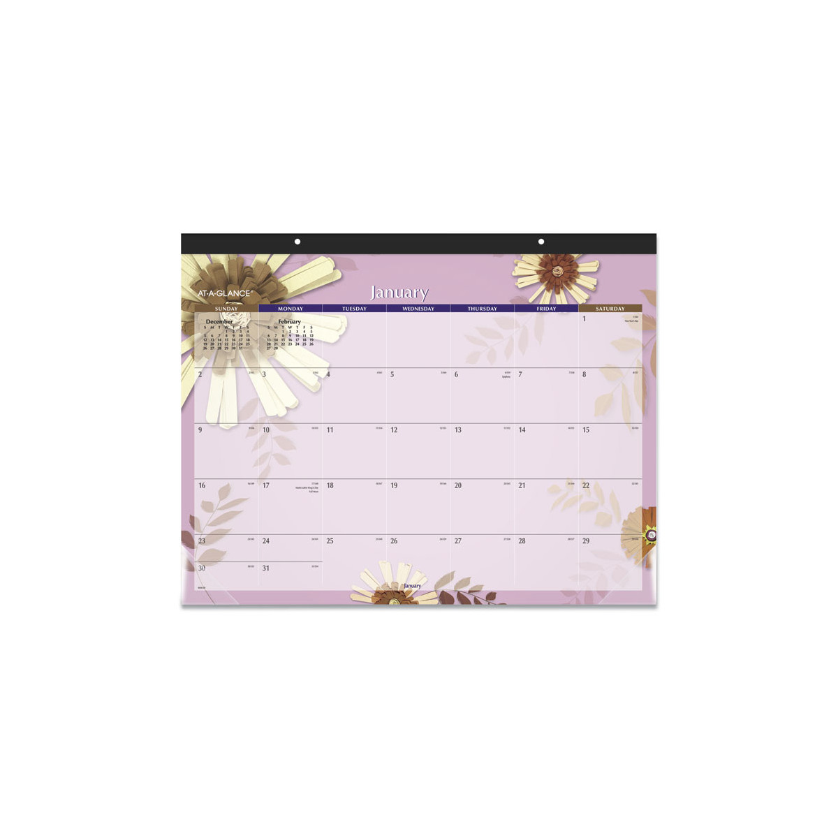 Features a new bright floral design each month. Durable backboard provides a sturdy writing surface. One month per page with unruled blocks. Past and future months reference. Black, wide paper headband with eyelets; two clear corners. Perforated pages.