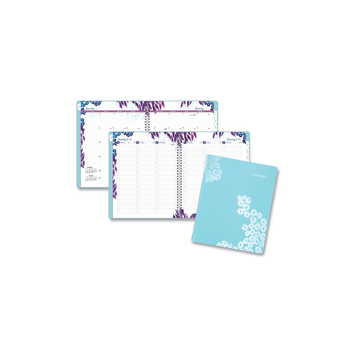 Wild Washes planner has a animal-inspired print on the front cover and page borders, contrasting from light on the front to bold on the interior. One week per two-page spread is column style with each weekday getting a full column featuring appointment times. One month per two-page spread features ruled daily blocks to keep handwriting neat, plus a notes column for extra details. Months are tabbed for navigation. Special pages: 3-year reference calendar, holiday list, event calendar, contacts and notes pages.