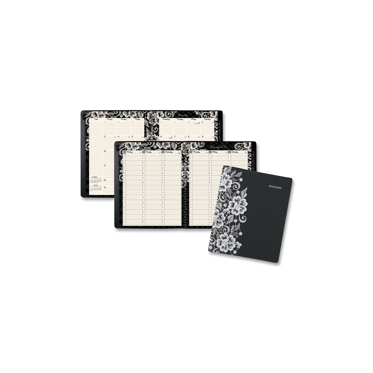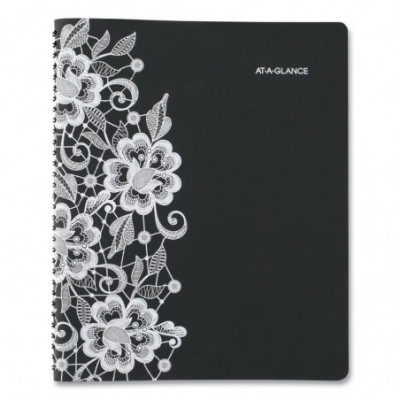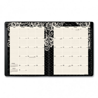 Planner features a lacy overlay with a cream floral pattern on black. Covers 13 months from January to January with Julian dates. High-quality paper features superior ink bleed resistance. One week per two-page spread has ruled columns for each day with hourly appointments from 8AM to 6:00PM Monday through Friday. Weekends are untimed. One month per two-page spread has ruled daily blocks, notes space, and past/future month calendar references. Each month is tabbed to quickly flip to any date. Special pages include a holiday listing, 3-year reference calendar, event calendar, future planning, contacts and notes. Double-sided poly pocket for storage included. Durable twin wire binding.