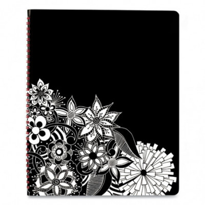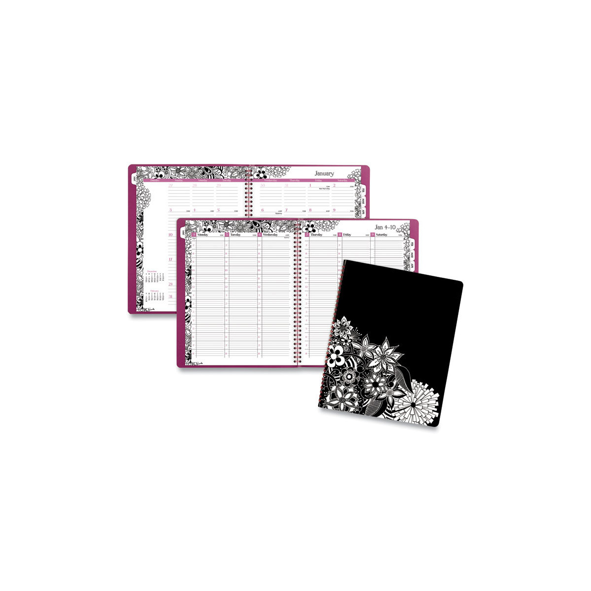 Color your planner! Attractive design features white flowers on a black backdrop, where the flowers, petals and squiggles lay overtop one another to create a one of a kind pattern, and extra pages between each month feature different designs, all of which encourage coloring and doodling. Planner covers 13 months with Julian dates for a full year of weekly and monthly planning plus one bonus month. One week per two page spread with an equal amount of ruled planning space for each day Monday Sunday to record daily plans and tasks. A blank space for doodles starts off each week to spend free time drawing. One month per two page spread has ruled daily blocks, blank doodles space and past/future month reference calendars to manage upcoming events. Monthly spreads are also tabbed for easy planner navigation. Special pages included: holiday list, 3 year reference calendar, event calendar, contacts pages, notes pages and future planning pages for next year. Each page features bold black borders with the white flower pattern across the top. Quality white paper resists ink bleed. Wirebound with pink wire, and the interior of the front and back covers are a matching pink color.