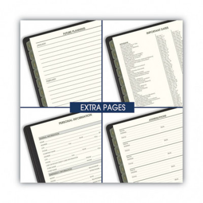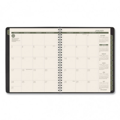 Show you care by choosing a monthly planner made from recycled materials. Features tips for "green living." Tabbed one month per two-page spread with unruled blocks; past, current and four future months reference. Telephone/address page.