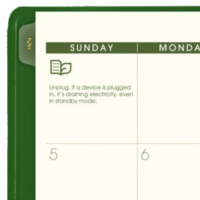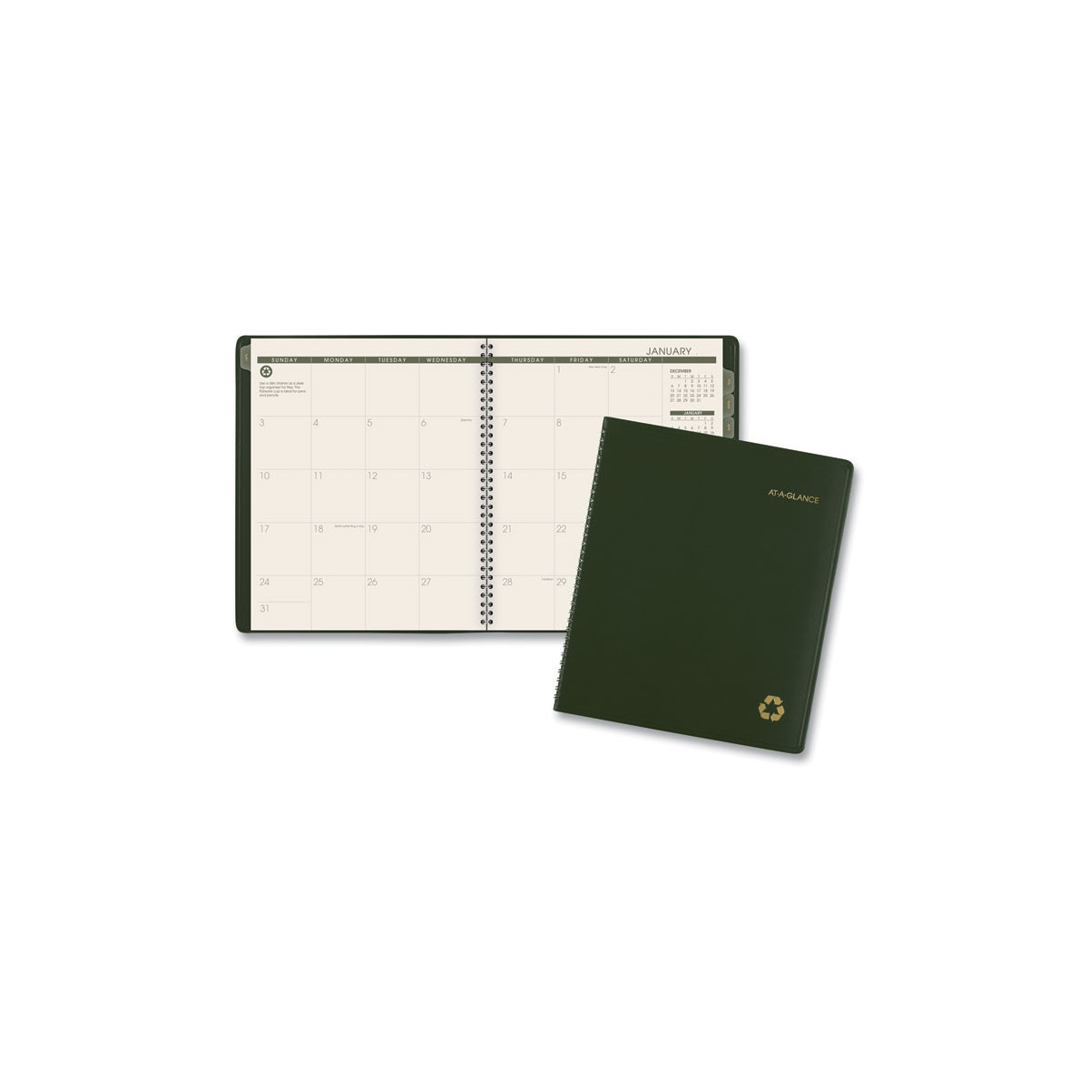 Show you care by choosing a monthly planner made from recycled materials. Features tips for "green living." Tabbed one month per two-page spread with unruled blocks; past, current and four future months reference. Telephone/address page.