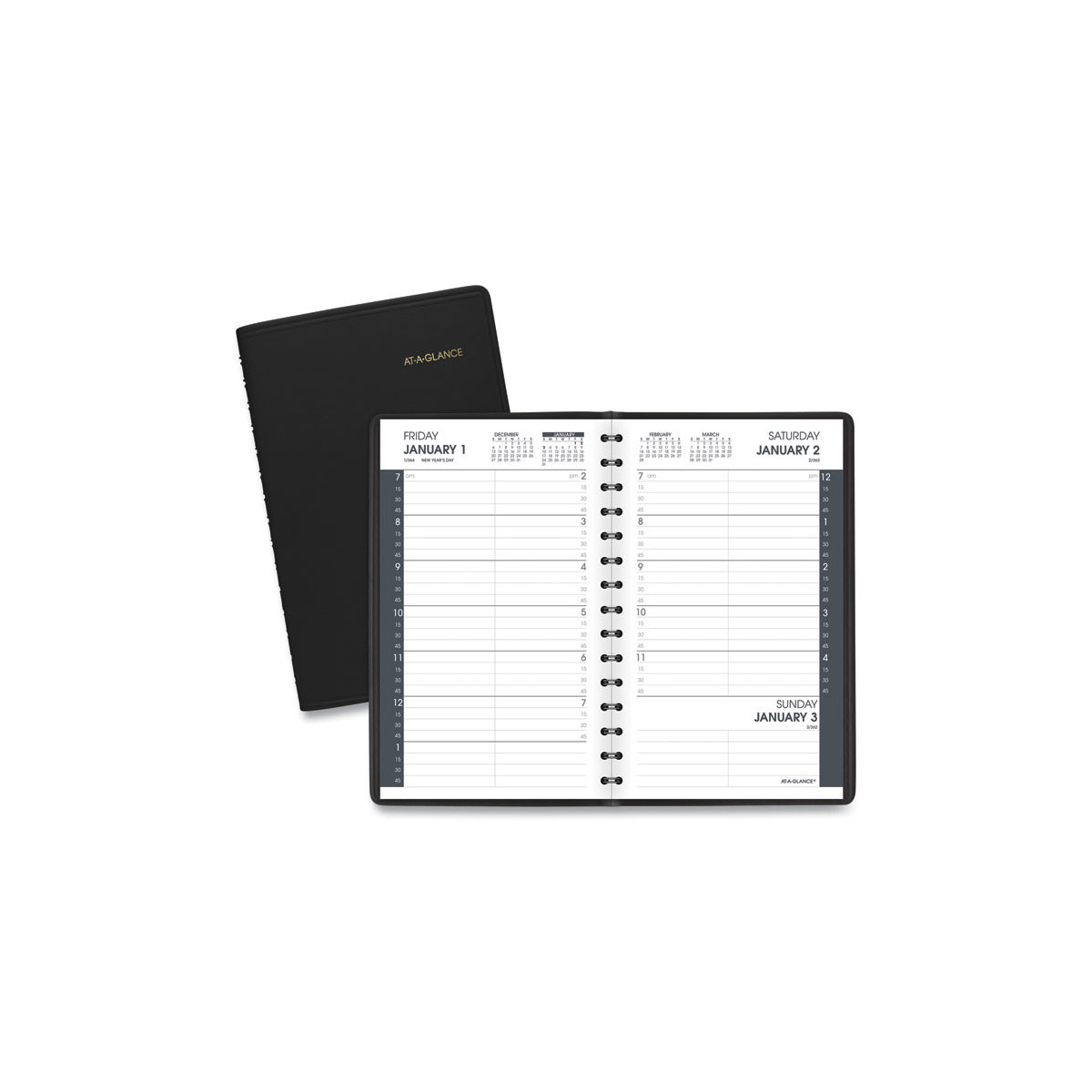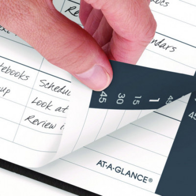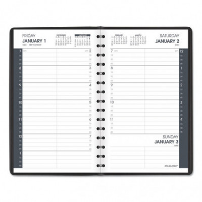 AT-A-GLANCE daily planner offers a simple, easy to follow one day per page format. The perfect solution to lay out daily tasks and activities. Track an entire year from January - December. Julian dates are included. Each hour is broken down in 15 minute intervals to allow for detailed time management. Times run 7:00 a.m. - 7:45 p.m. on weekdays and until 4:45 p.m. on Saturday. Each time is allotted half a line to quickly jot down a meeting or project.