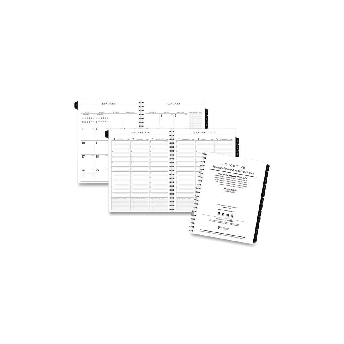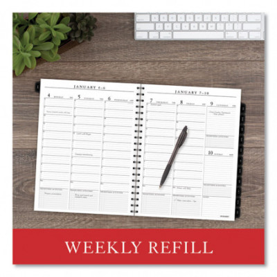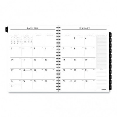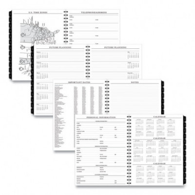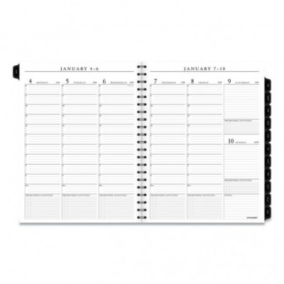 Premium paper resists ink bleed. Weekly: one week per two-page spread, column-style appointments. Monthly: one month per two-page spread with unruled blocks; past and future months reference; Reinforced tabs. Removable telephone and address book. Expand your organizational skills with special pages. Includes reference calendars, future planning pages, expense tracking, important dates and notes pages.