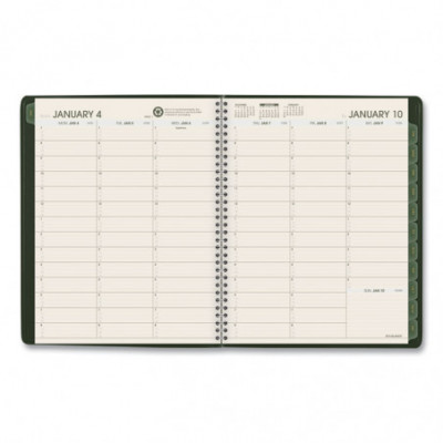 Use products with high post-consumer recycled materials content. Features tips for "green living" each week. Weekly: one week per two-page spread; past, current and two future months reference. Monthly: tabbed one month per two-page spread with unruled blocks; past, current and four future months reference. Telephone/address pages.