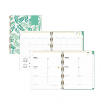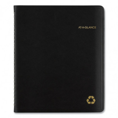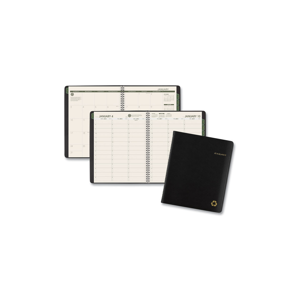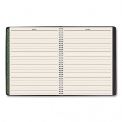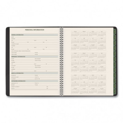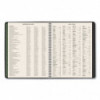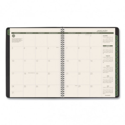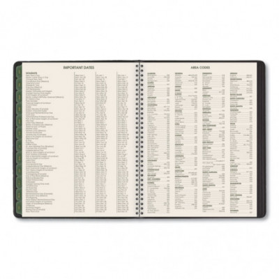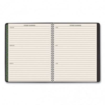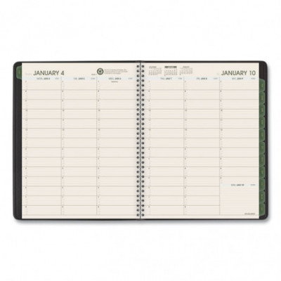 Use products with high post-consumer recycled materials content. Features tips for "green living" each week. Weekly: one week per two-page spread; past, current and two future months reference. Monthly: tabbed one month per two-page spread with unruled blocks; past, current and four future months reference. Telephone/address pages.