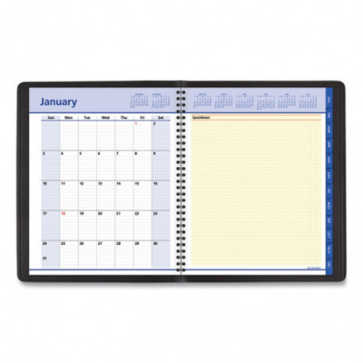 Yellow highlighted section for notes and to-do's. Premium paper resists ink bleed. Includes storage pocket. Weekly: one week per two-page spread with QuickNotes® area. Monthly: step-tabbed full month with ruled blocks on left page, QuickNotes® area on right page; two past and six future months reference. Federal holidays highlighted.