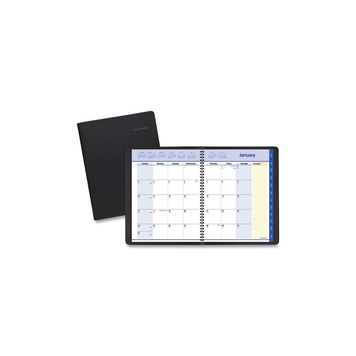 Yellow highlighted section for notes and to-do's. Includes storage pocket. One month per two-page spread with unruled blocks; QuickNotes® column. Two past and six future months reference; federal holidays highlighted. 40 QuickNotes® notes pages.