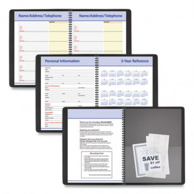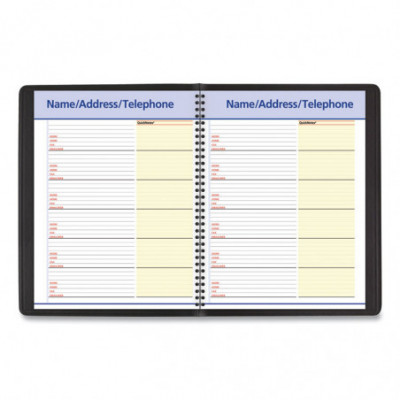 Yellow highlighted section for notes and to-do's. Premium paper resists ink bleed. Includes storage pocket. One month per two-page spread with unruled blocks; QuickNotes® column. Two past and six future months reference; federal holidays highlighted. Telephone/address pages; 40 QuickNotes® notes pages. Printed on high-quality paper with superior ink bleed resistance.