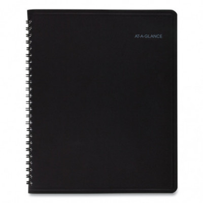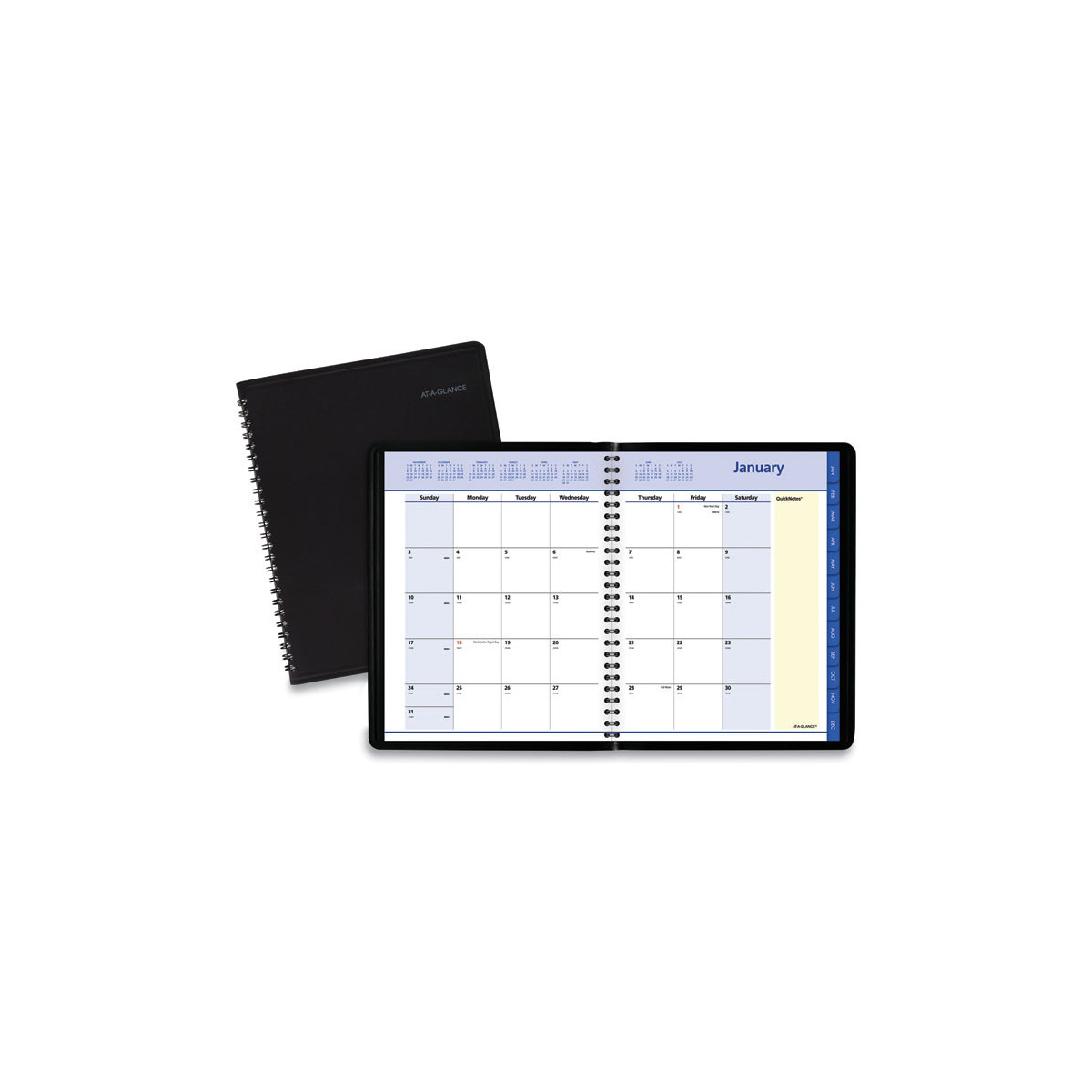 Yellow highlighted section for notes and to-do's. Includes storage pocket. One month per two-page spread with unruled blocks; QuickNotes® column. Two past and six future months reference; federal holidays highlighted. 40 QuickNotes® notes pages.