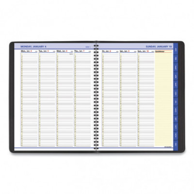 Yellow highlighted section for notes and to-do's. Premium paper resists ink bleed. Includes storage pocket. Weekly: one week per two-page spread with QuickNotes® area. Monthly: step-tabbed full month with ruled blocks on left page, QuickNotes® area on right page.