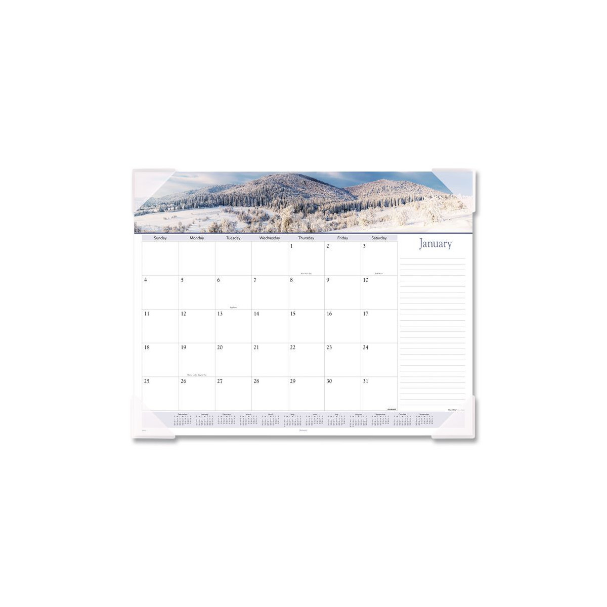 New landscape photography featured each month. Durable backboard provides a sturdy writing surface. Features full-color, wide-view photos. One month per page with unruled blocks and lined notes space. Full-year calendar reference. Four, clear poly corners to keep pages flat. Printed on high-quality with superior ink bleed resistance.
