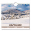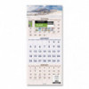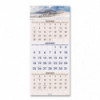 Vertical three-month view with scenic photography on each page. Features full-color photos. Three months per page. Bonus page: current-year reference calendar. Chipboard backing; white wirebound with hanging loop. High-quality, paper.