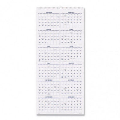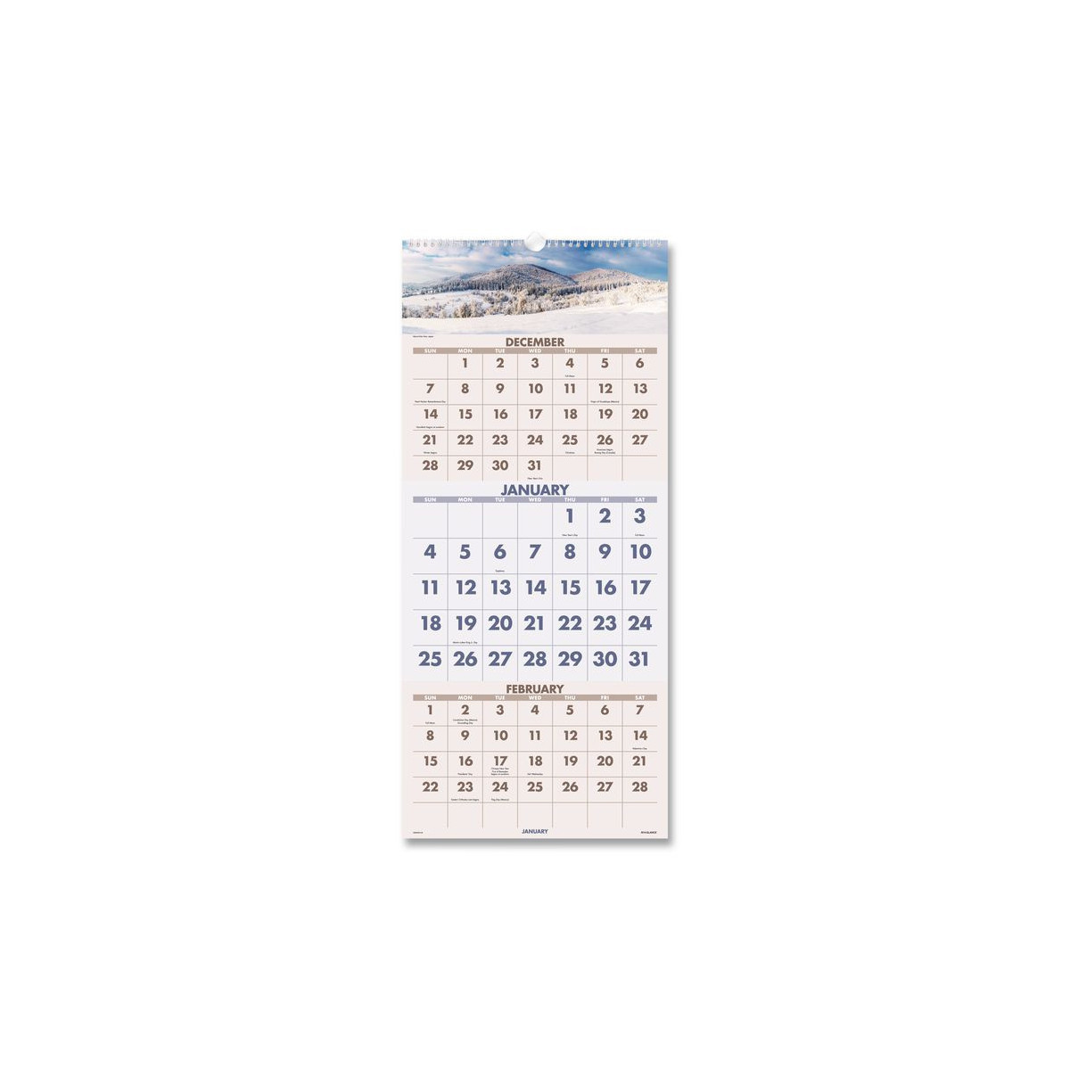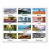 Vertical three-month view with scenic photography on each page. Features full-color photos. Three months per page. Bonus page: current-year reference calendar. Chipboard backing; white wirebound with hanging loop.