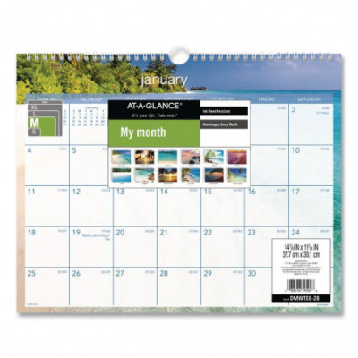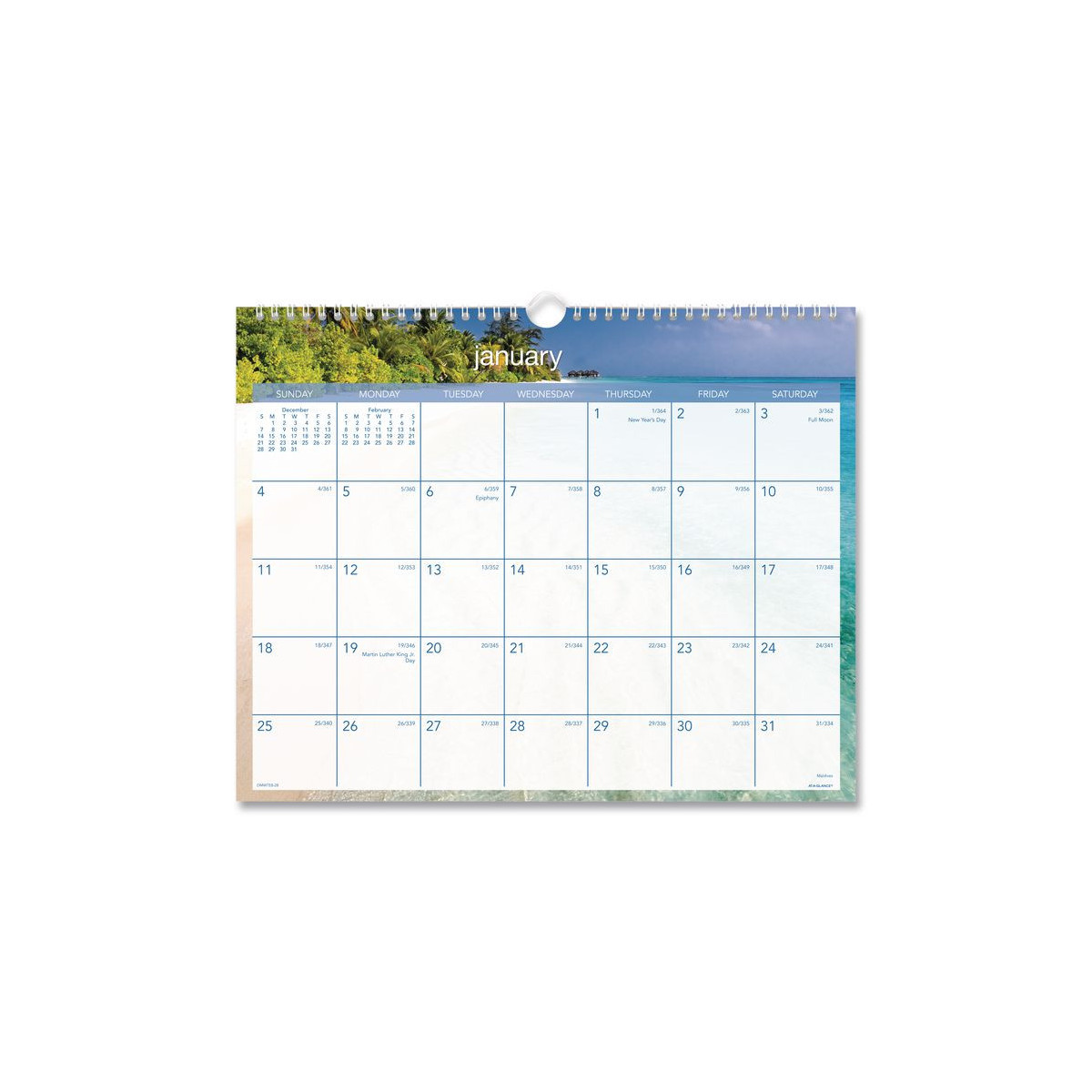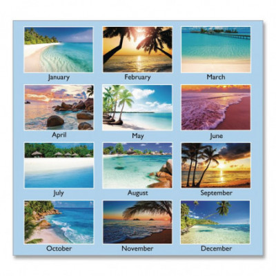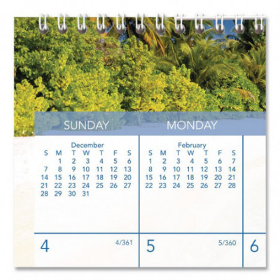 Travel to a different tropical locale every month -- this calendar is sure to brighten your spirits with its full-color images. One month per page with unruled blocks; past and future months reference. Chipboard backing; wirebound with hanging loop. Printed on high-quality, recycled paper containing post-consumer recycled material.