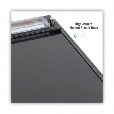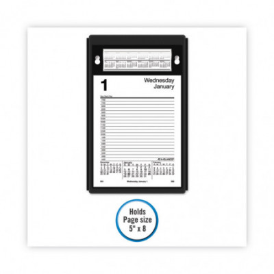 Keeps your two-ring desk calendar at the perfect position to make writing and reading notes easy. Five plastic feet prevent the base from scratching or sliding. Constructed of black molded plastic. Holds any desk calendar with up to 5" x 8" page size.