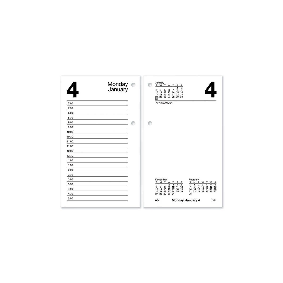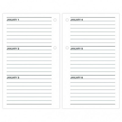 Half-hour appointment times. One day per two-page spread with a unique design; Saturday/Sunday combined. Past, current and future months reference. Loose-leaf, two-hole punched pages for E17-style calendar bases.