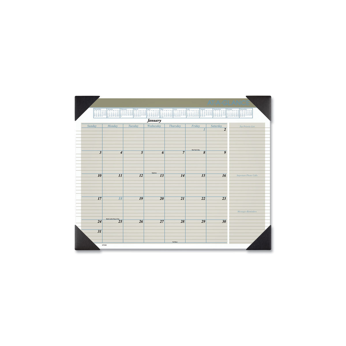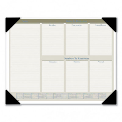Track your schedule, priorities, phone calls and messages. Durable backboard provides a sturdy writing surface. One month per page with ruled blocks and lined notes space. Full-year calendar reference. Bonus pages: current- and future-year reference calendars and dates to remember. Perforated pages allow for easy and clean removal of used calendar pages. Four black poly corners securely hold each month's calendar in place. Printed on high-quality paper with superior ink bleed resistance.
