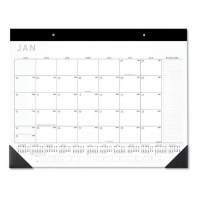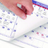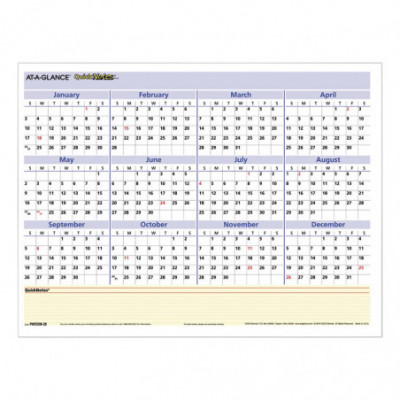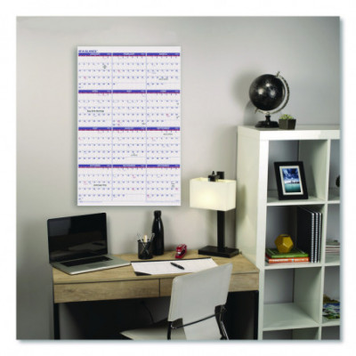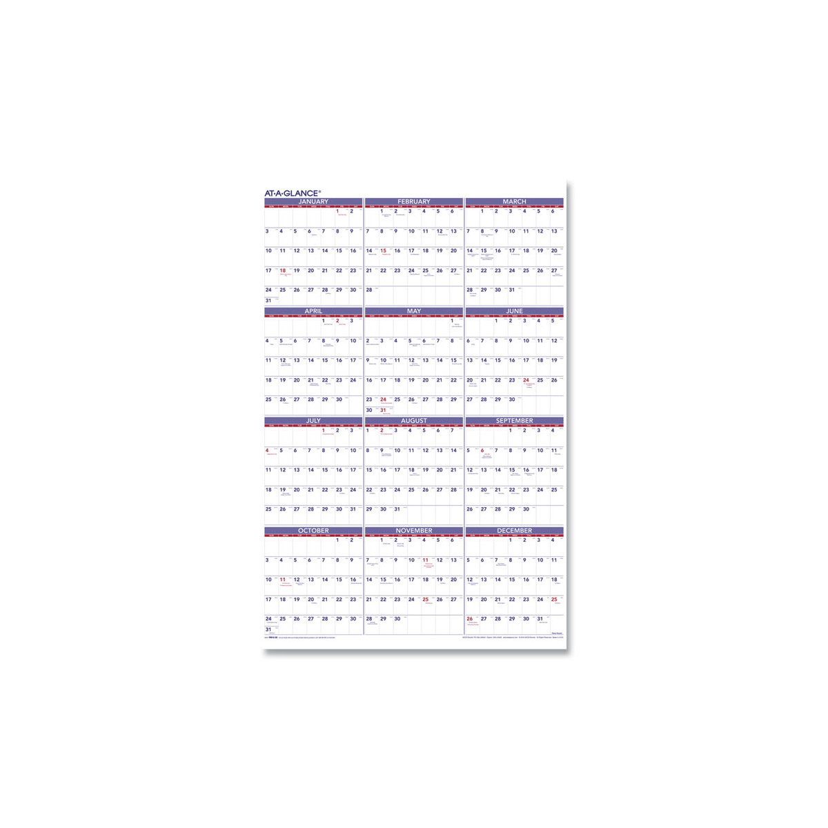 Entire year is displayed on one page with four rows of three months each. Alternating quarters are shaded and federal holidays highlighted in red for clear differentiation. Metal bound at top and bottom with hanging eyelet. Contemporary design with plenty of writing space. Printed in blue and red ink on high-quality, recycled paper.