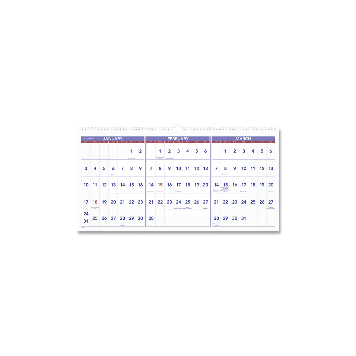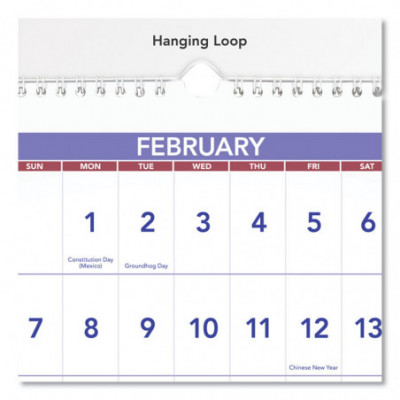 Three-month per page view: past, current and future months. Large, easy-to-read numbers. Federal holidays highlighted. White wirebound with hanging loop.