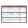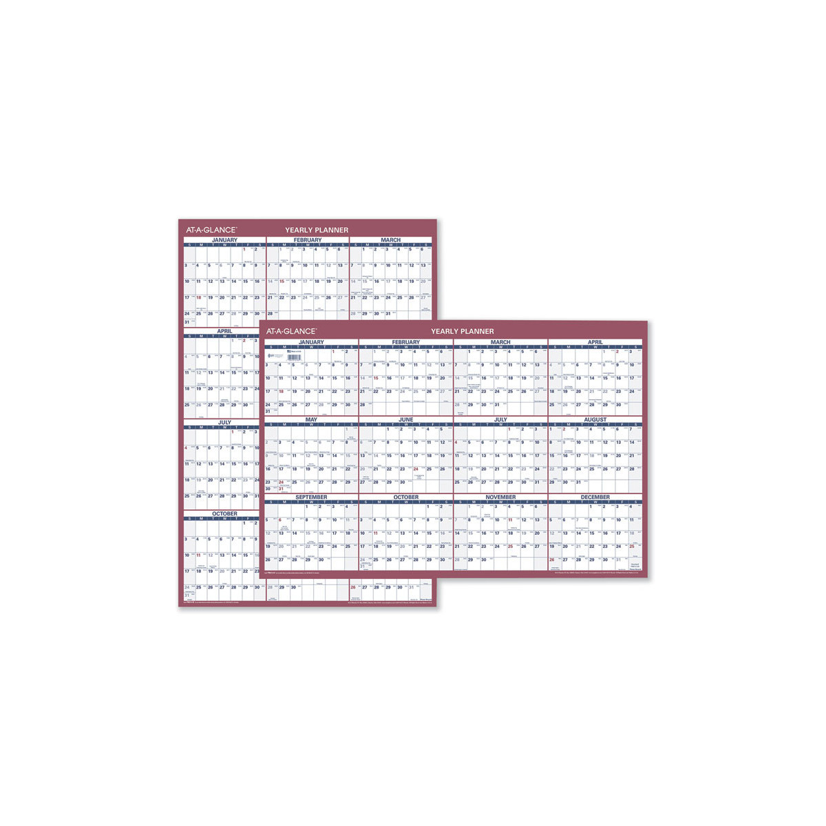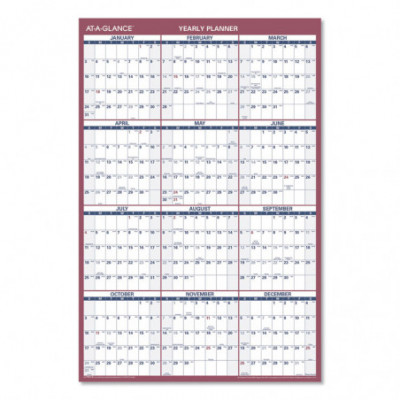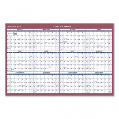 Reversible: horizontal or vertical annual view. Full-year calendar with open blocks featured on both sides. Federal holidays clearly marked in red. Border and print are red and blue with a bright white background.