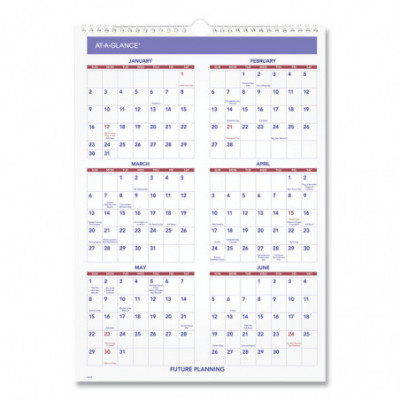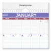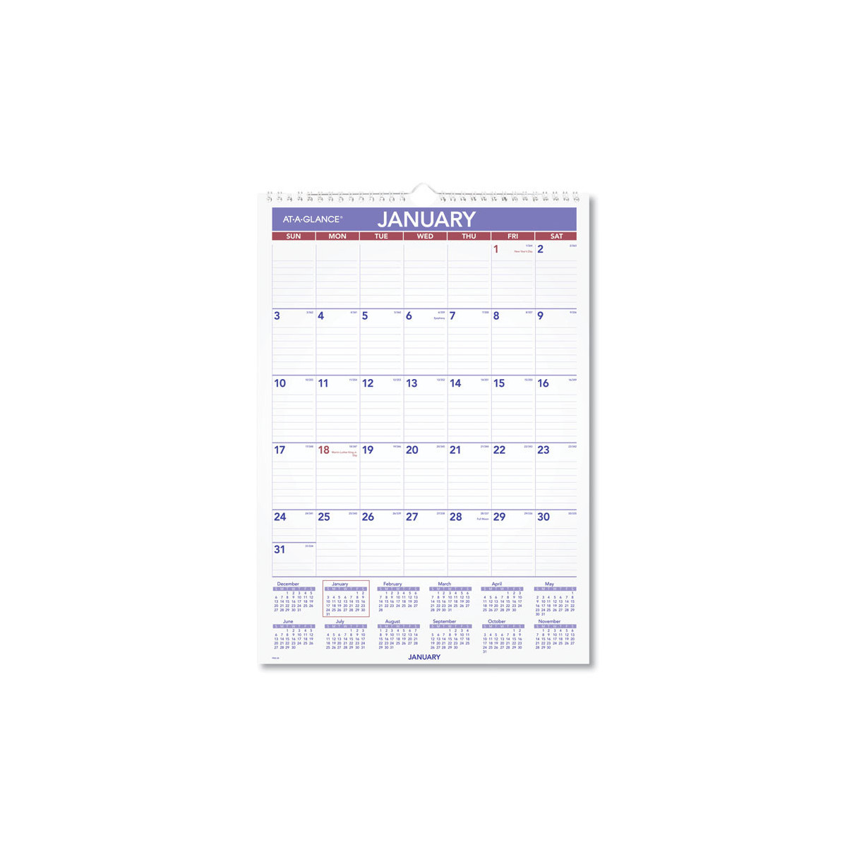 One-month view, plus a yearly calendar reference. Ruled daily blocks. Federal holidays printed in red. Wirebound with hanging loop. Full chipboard back. Printed on high-quality paper.