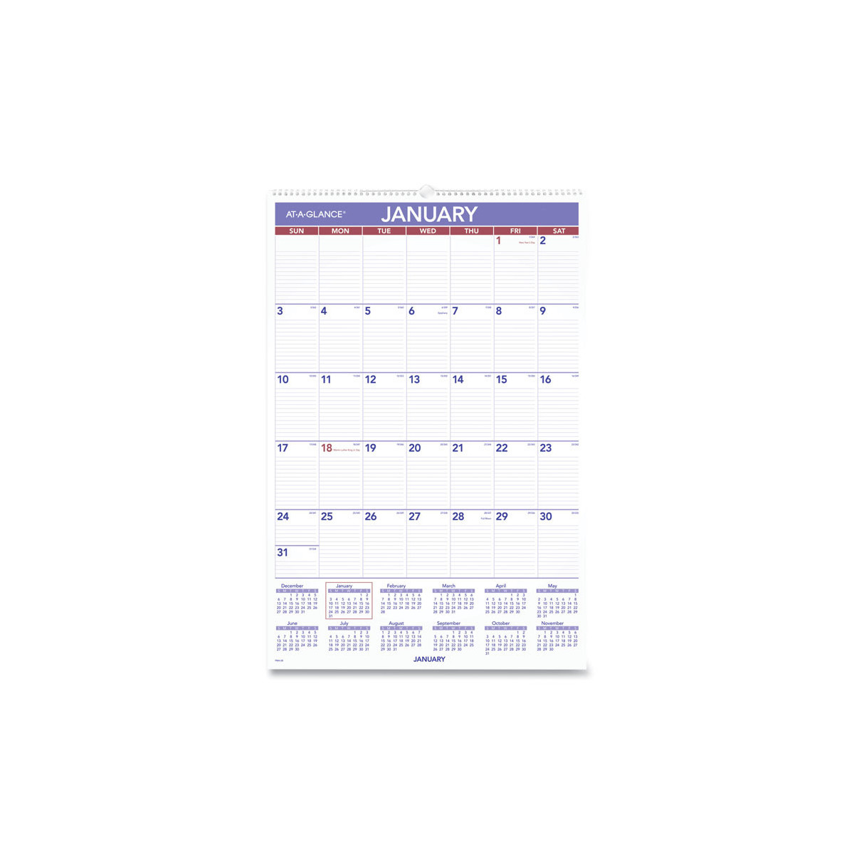 One-month view, plus a yearly calendar reference. Ruled daily blocks. Federal holidays printed in red. Wirebound with hanging loop. Full chipboard back. Printed on high-quality paper.