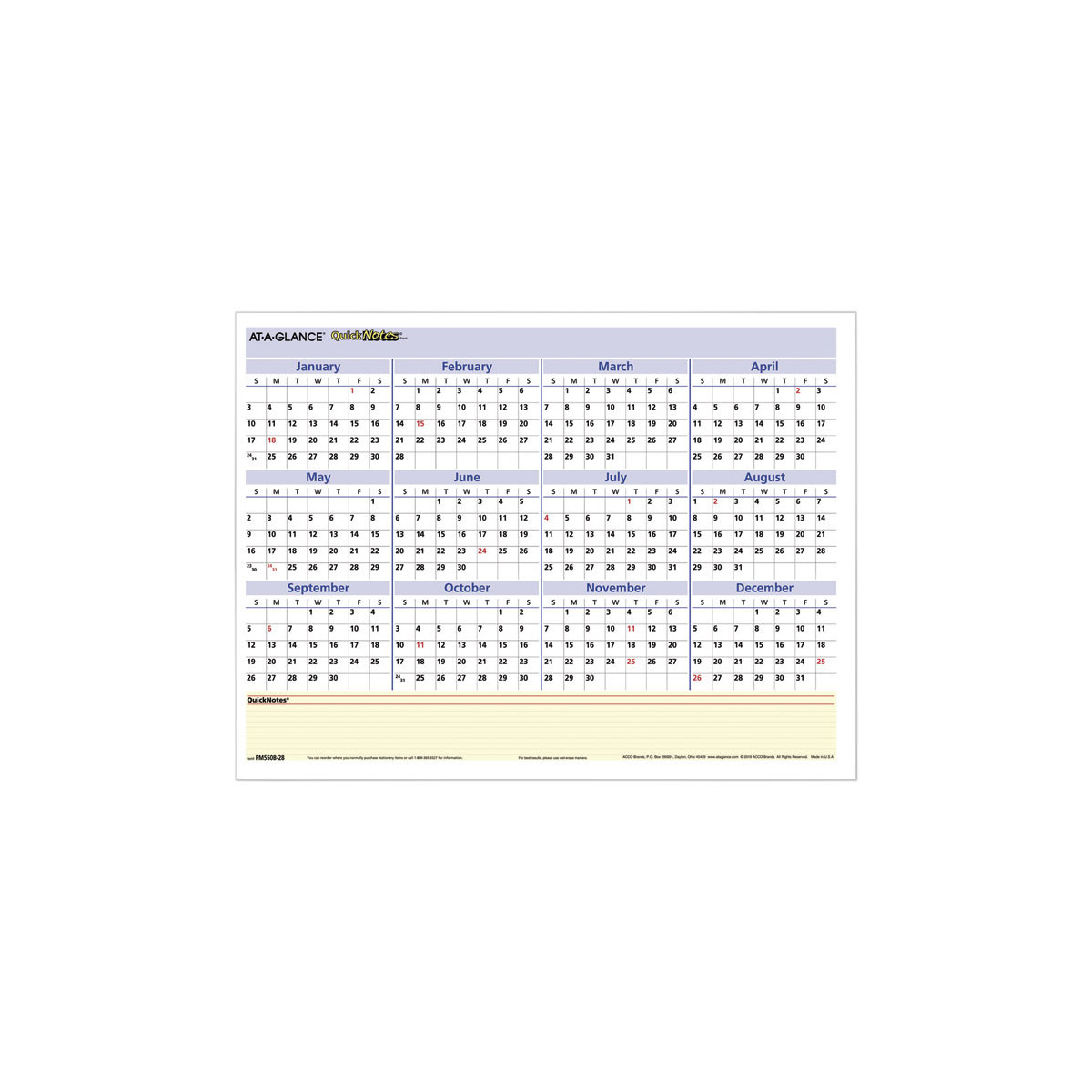 Yellow highlighted section for notes and to-do's. Perfect for small cubicles and wall spaces; great for quick date referencing. Reversible with write-on/wipe-off surface; for use with wet-erase markers. Monday-Friday blocks are white while Saturday-Sunday blocks are light blue; federal holidays in red. Packaged flat. Printed in four colors on high-quality paper.