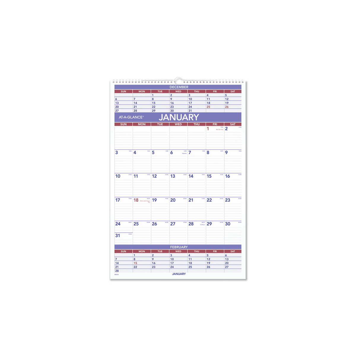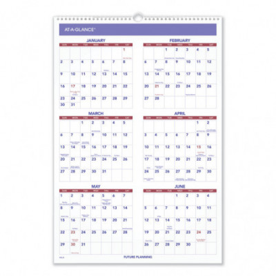 Three-month view with plenty of space for planning in the current month. Three months per page: large current month with ruled blocks, condensed past and future months. Federal holidays highlighted. Bonus page: six future months. Chipboard backing; white wirebound with hanging loop. Contemporary design with plenty of writing space. Printed on high-quality paper with superior ink bleed resistance.