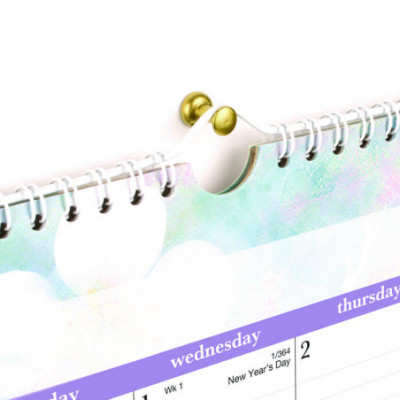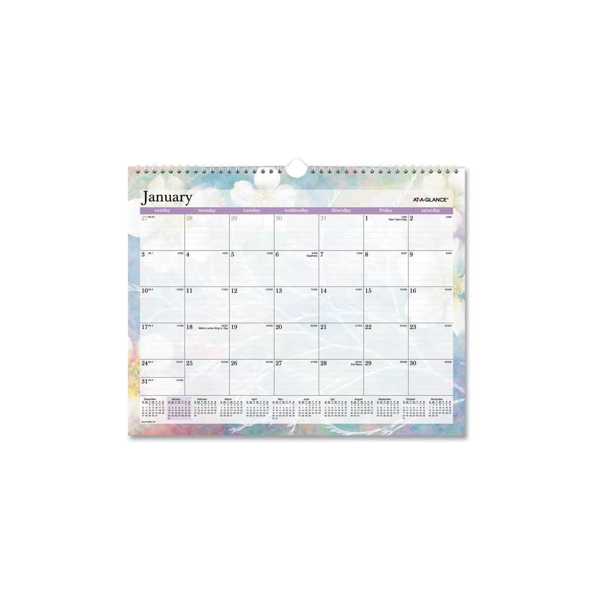Keep track of key dates from birthdays to work deadlines. Soft, muted, ghosted-flower design on each page rotates quarterly to keep each season fresh and inspiring. Easy to follow, one month per page format features ruled daily blocks to keep your notes and reminders neat and easy to read. Full year calendar reference runs across the bottom of each monthly page, making it easy for you to stay several steps ahead. Wirebound across the top with a hanging loop for wall display. Printed on high-quality paper for superior ink-bleed resistance.