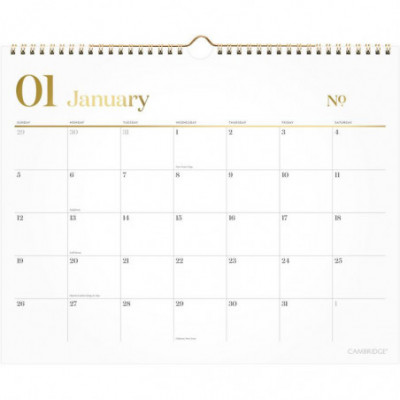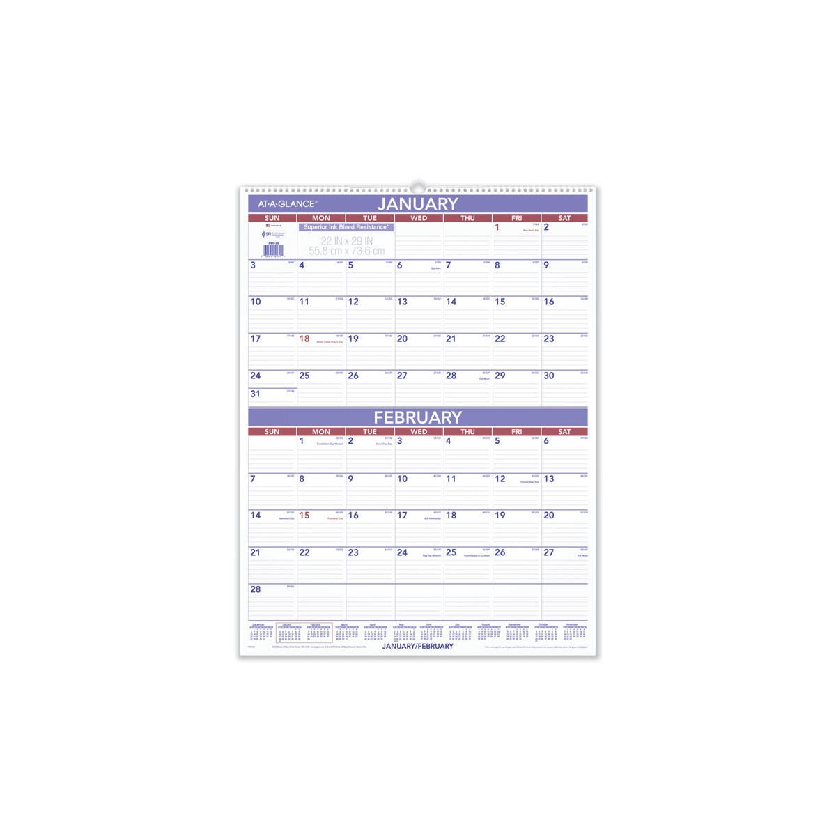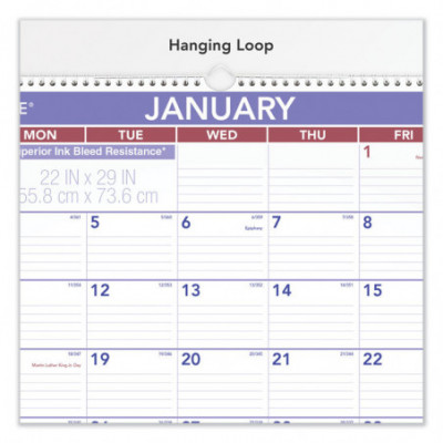 Displays two months at a time for easy planning. Two months per page (six pages total) with ruled blocks. Full-year calendar reference; federal holidays highlighted. White wirebound with hanging loop. Printed on high-quality with superior ink bleed resistance.