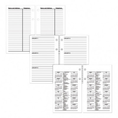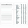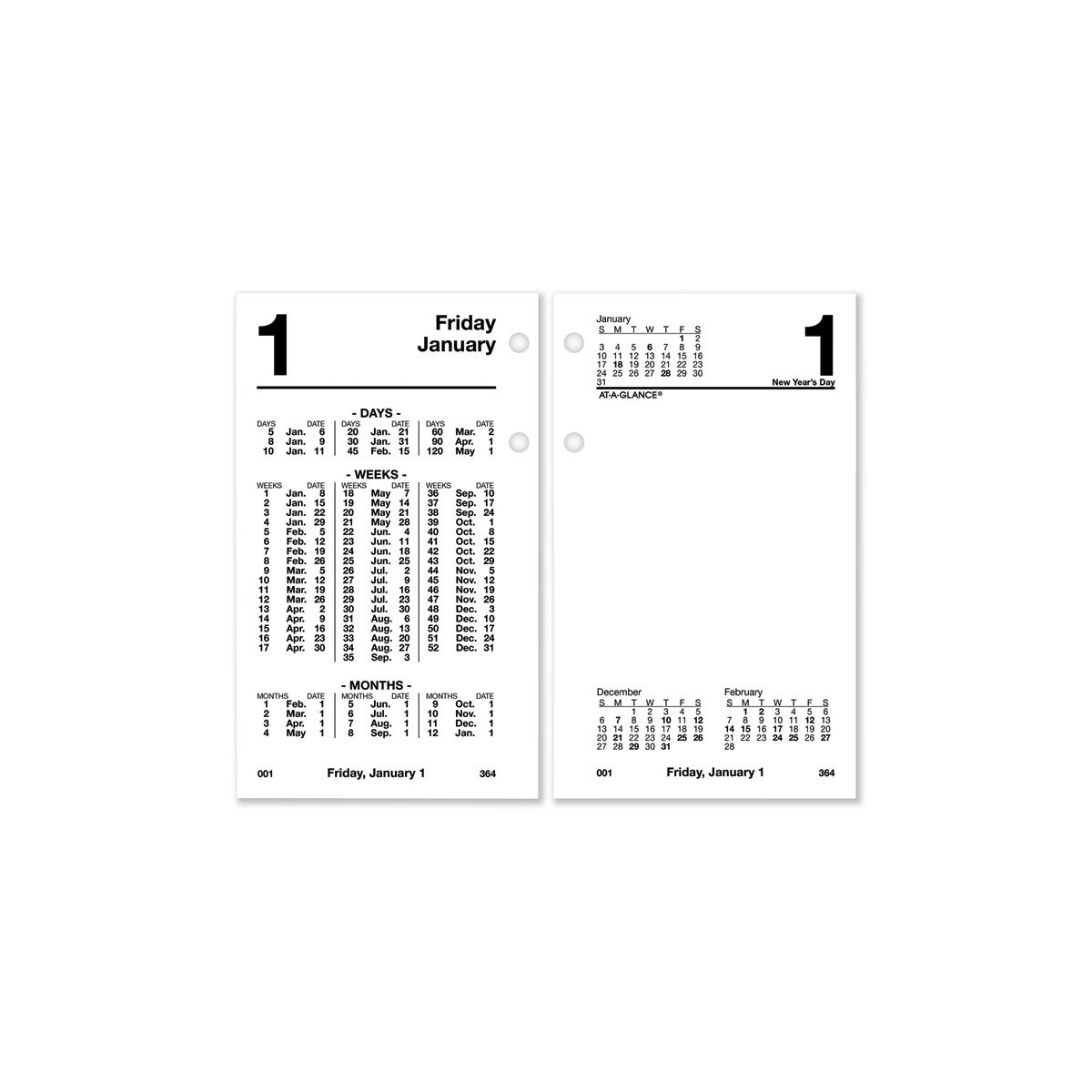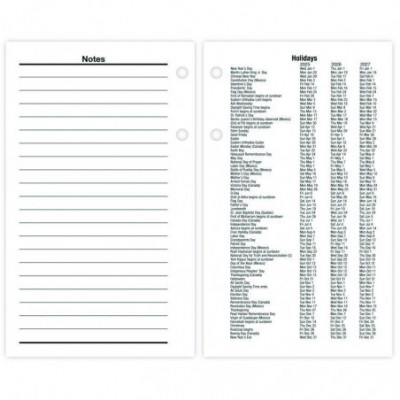 Financial-based dates in days, weeks and months. Features future date determination in days, weeks and months on left page with notes space on right. One day per two-page spread, Saturday/Sunday combined. Past, current and future months reference. Fits standard, 17-Style two-ring bases.