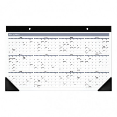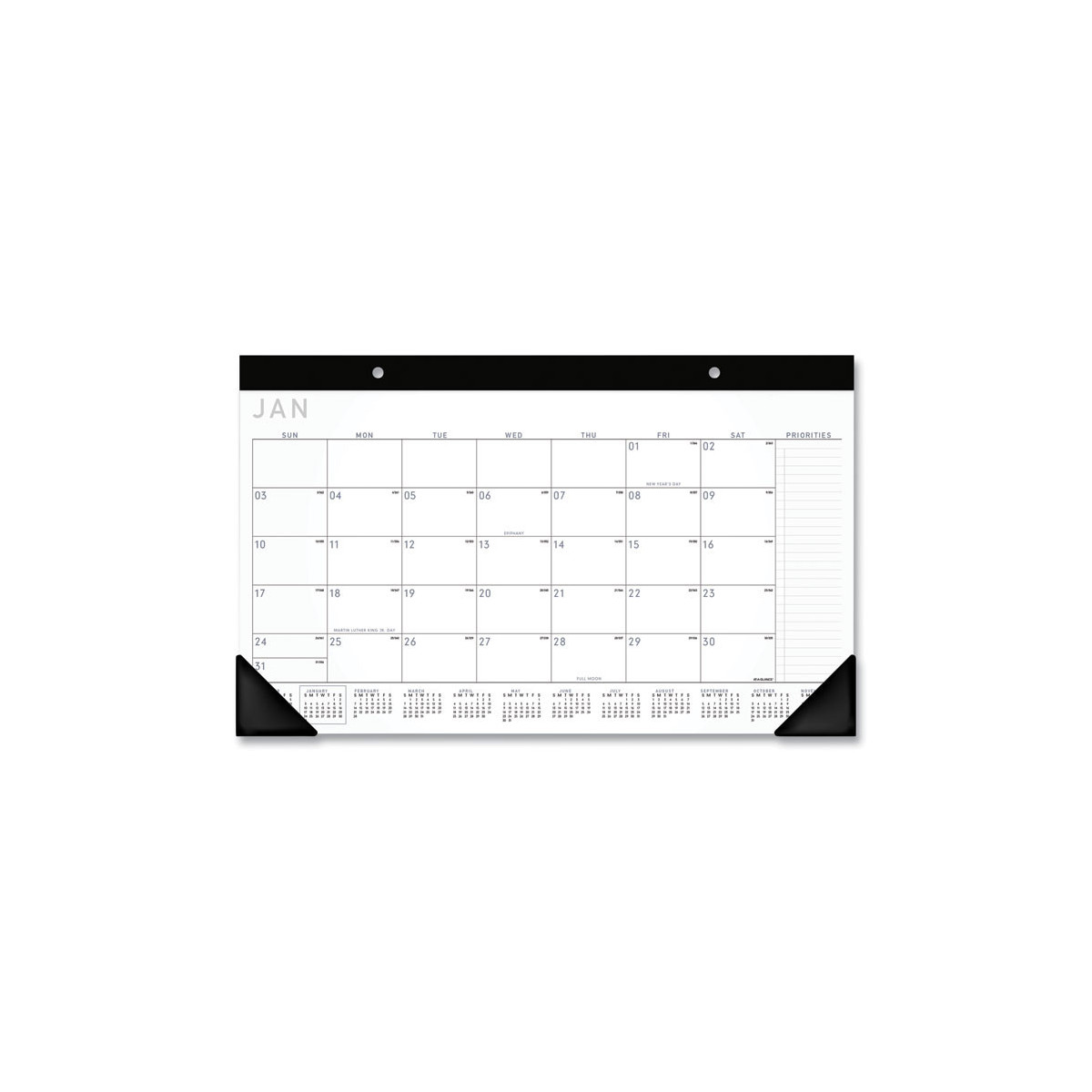 Contemporary desk pad features a fashion-forward color scheme and design elements. Monthly protection for your desktop with a full 12 months of planning. One month per page with unruled daily blocks to write in notes and reminders on each date. Extra writing space for priorities also included. Full year calendar reference on each monthly calendar page makes it easy to quickly look up dates. Desk pad pages are white with black top binding.