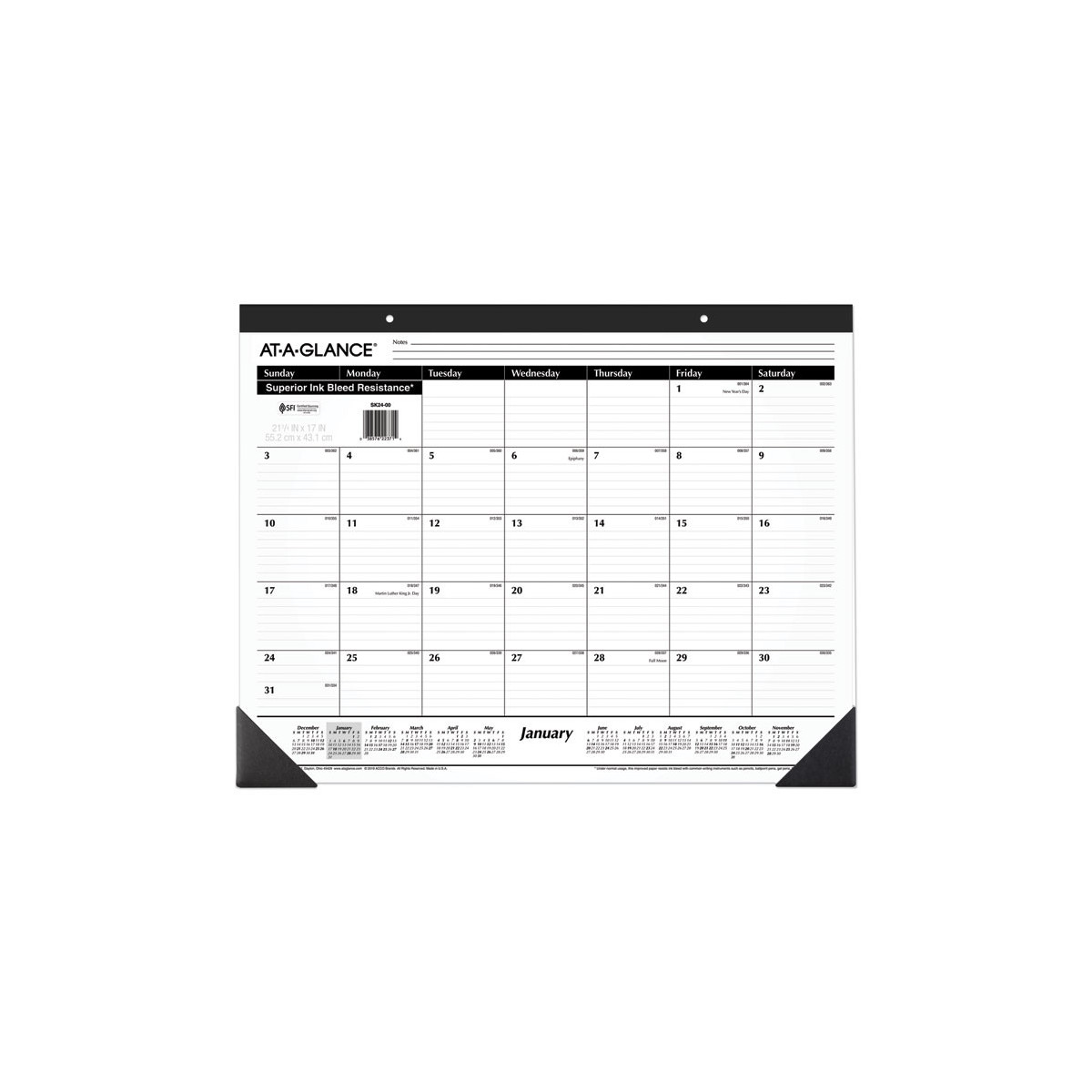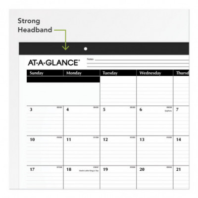 Classic lined format. One month per page with ruled blocks and lined notes space. Full-year calendar reference. Black paper headband with eyelets. Printed on high-quality paper with superior ink bleed resistance.