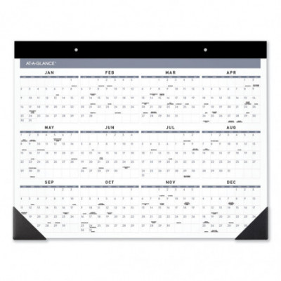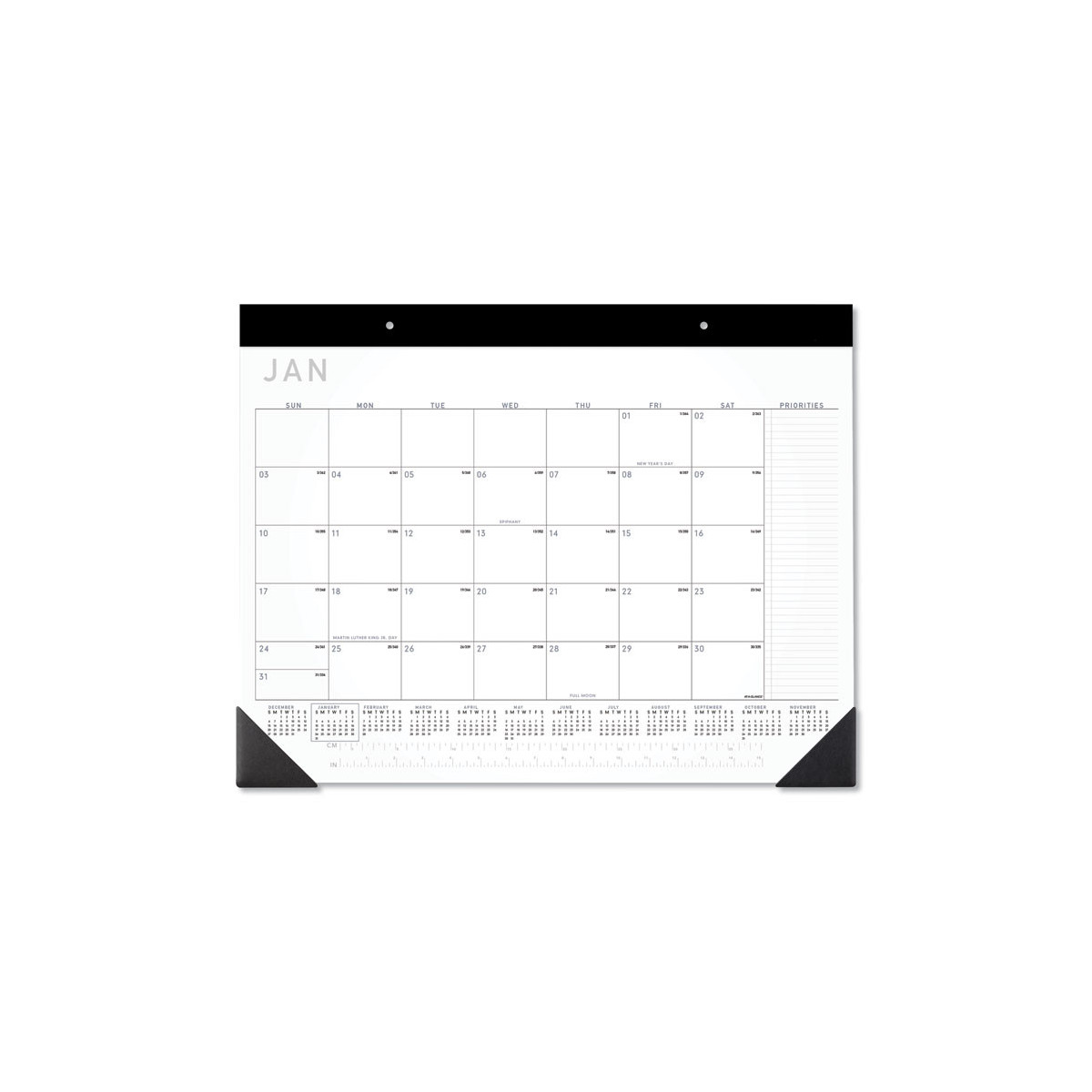 Contemporary desk pad features a fashion-forward color scheme and design elements. Monthly protection for your desktop with a full 12 months of planning. One month per page with unruled daily blocks to write in notes and reminders on each date. Extra writing space for priorities also included. Full year calendar reference on each monthly calendar page makes it easy to quickly look up dates. Desk pad pages are white with black top binding.