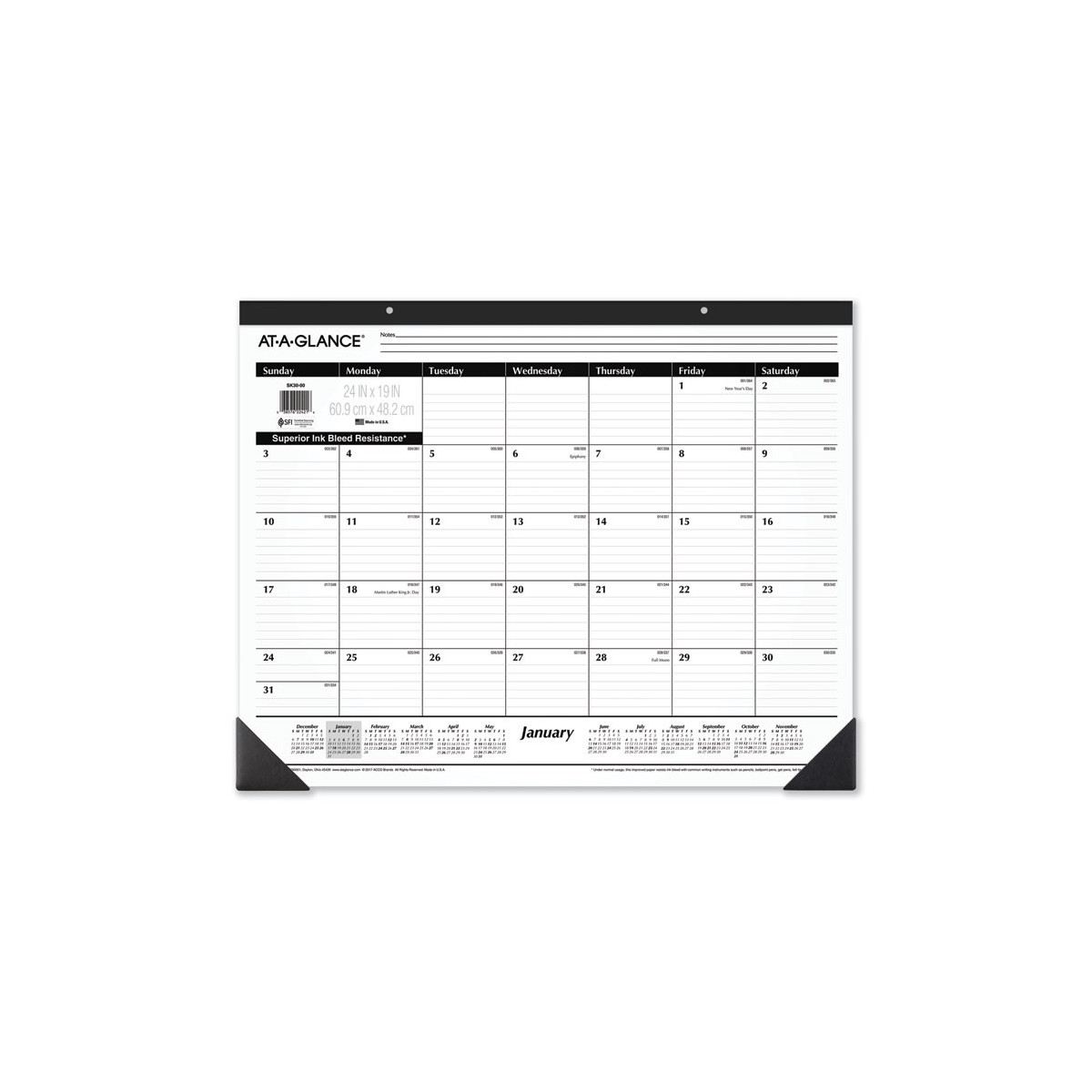 Classic lined format. One month per page with ruled blocks and lined notes space. Full-year calendar reference. Black paper headband with eyelets. Printed on high-quality paper with superior ink bleed resistance.