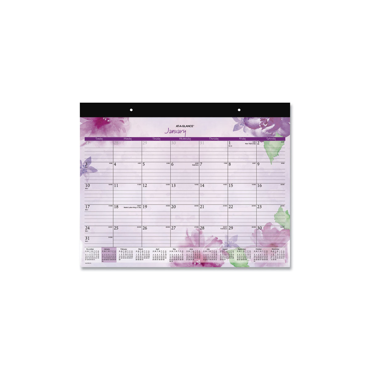 Add a nice splash of color to your workspace with this stylish desk pad. The pages feature a new design each quarter, filled with watercolor flowers and soft colors. The spacious calendar is beautiful and colorful, providing plenty of space to plan. High-quality paper features superior ink bleed resistance.