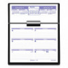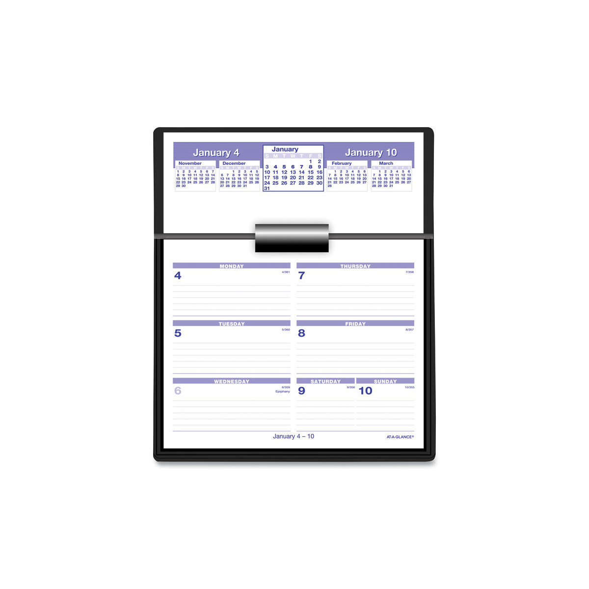 Weekly pages flip up and drop into a convenient storage base. One week per page, ruled for open scheduling. Current, two past and two future months reference; federal holidays highlighted. Printed in blue and red inks. One-ring calendar base is made of durable, black plastic.
