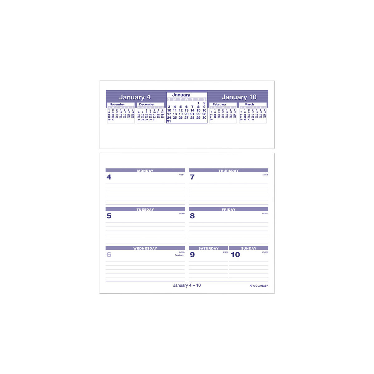 Weekly pages flip up and drop into convenient storage base. One week per page, ruled for open scheduling. Current, two past and two future months reference; federal holidays highlighted.