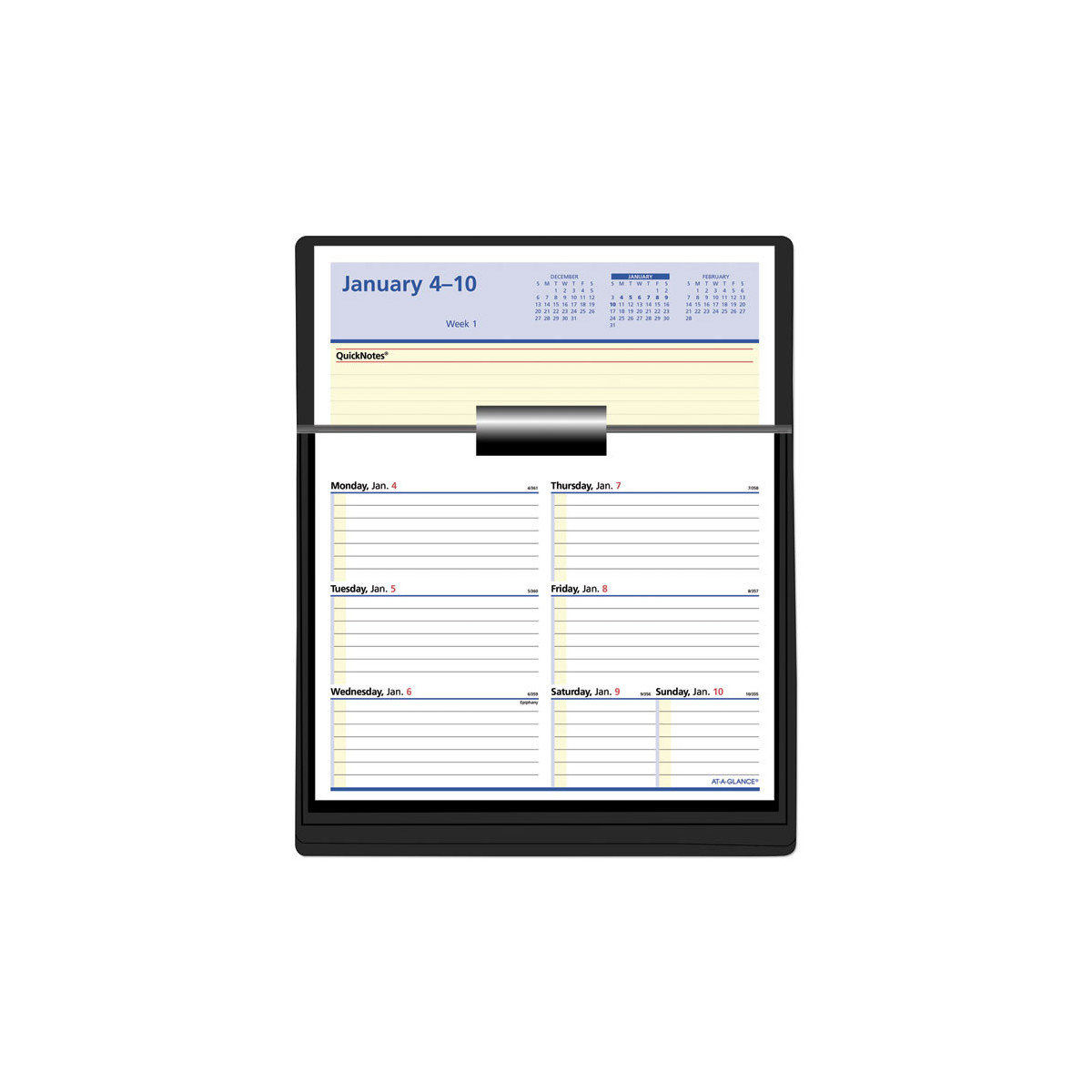 Yellow highlighted section for notes and to-do's. Weekly pages flip up and drop into convenient storage base. One week per page, ruled for open scheduling. Past, current and future months reference; federal holidays highlighted. Printed in blue, yellow and red inks. (Base not included.)