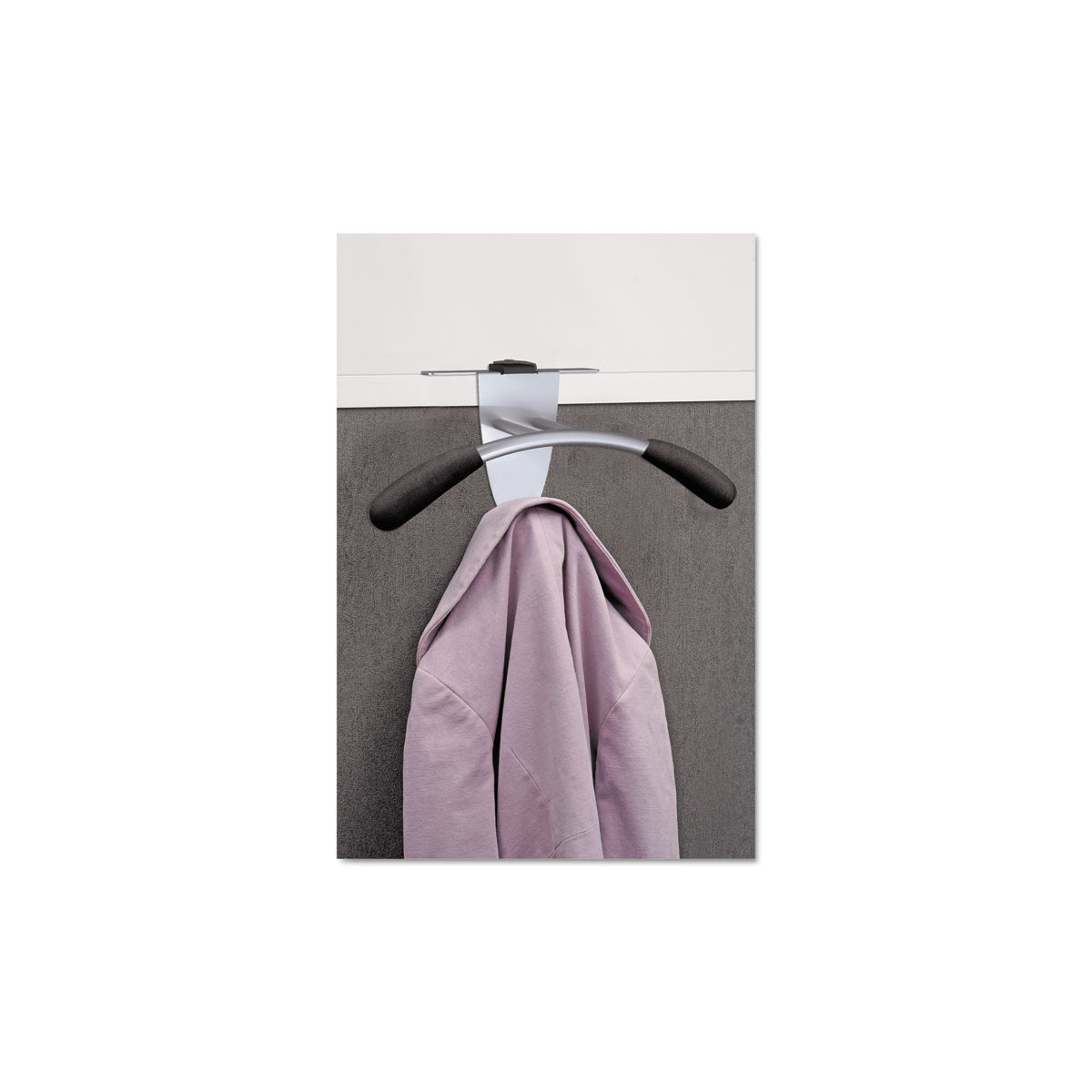 Hook/hanger combination with anti-slip foam and one black plastic coat peg. Keeps garments secure, clean and wrinkle-free. Adjustable to partition widths from 1 1/5" to 4 1/10".