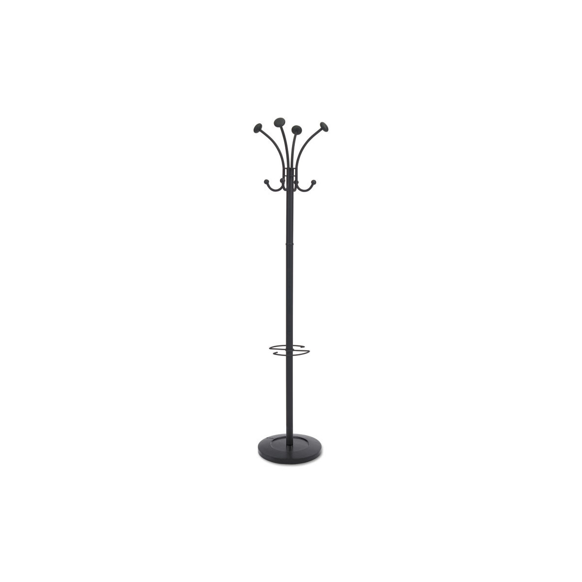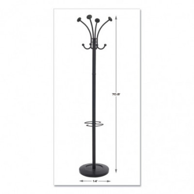 Provides four coat knobs, four accessory hooks and an integrated umbrella stand with water retainer. Rotating head for easy access to clothes. Weighted base for perfect stability. Easy assembly without tools.