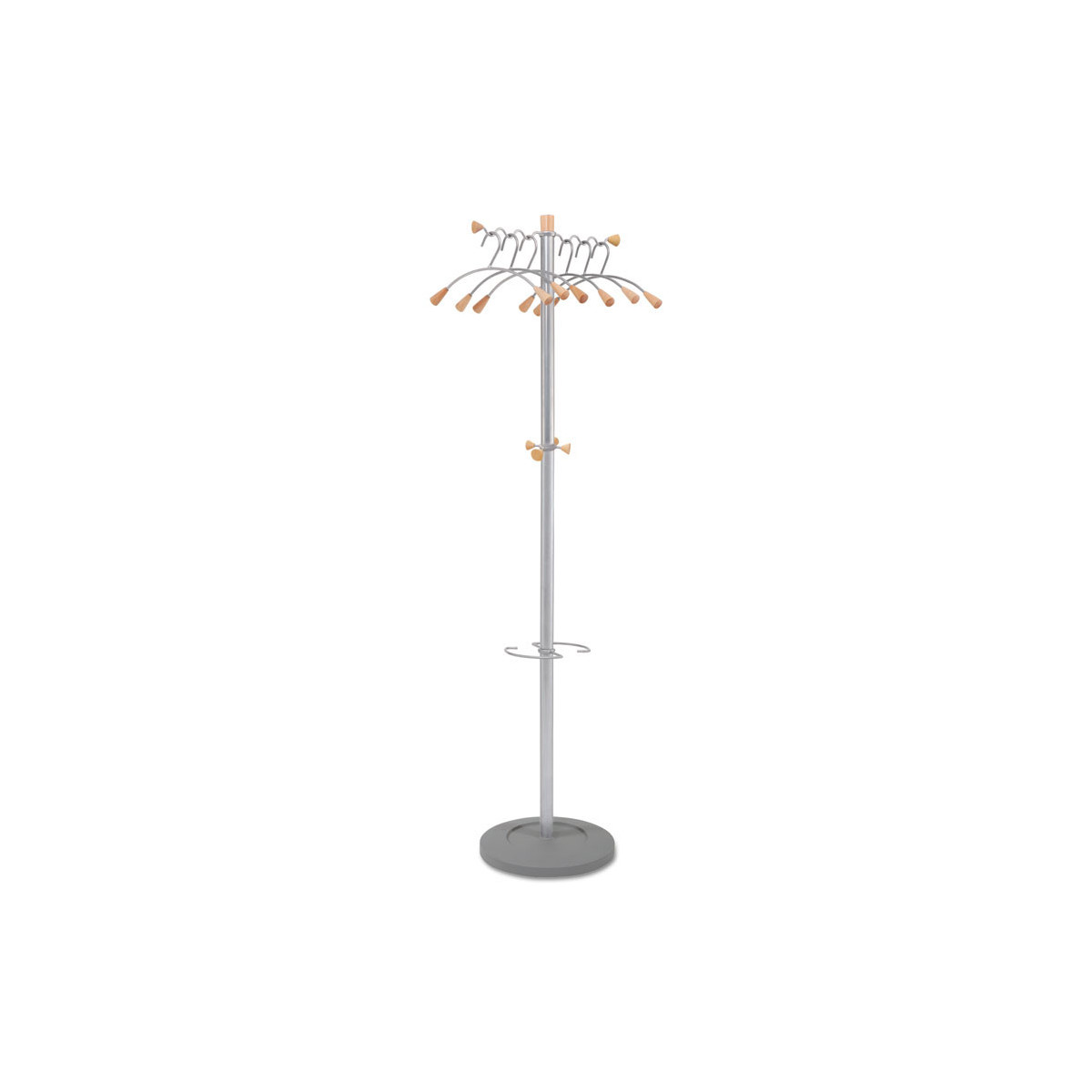 Ideal coat stand for when space is limited. Two wood coat/accessory knobs and four wood accessory hooks. Integrated umbrella stand with removable water container.