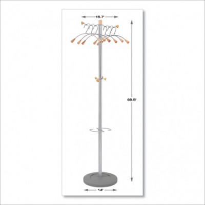 Features six wood and metal hangers. Four coat/accessory knobs and an integrated umbrella stand with a water retainer. Weighted base for great stability.