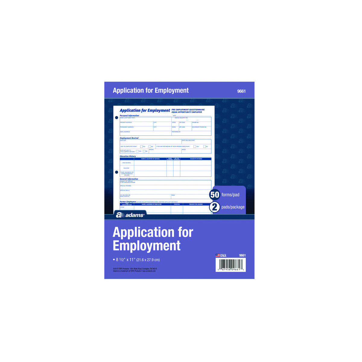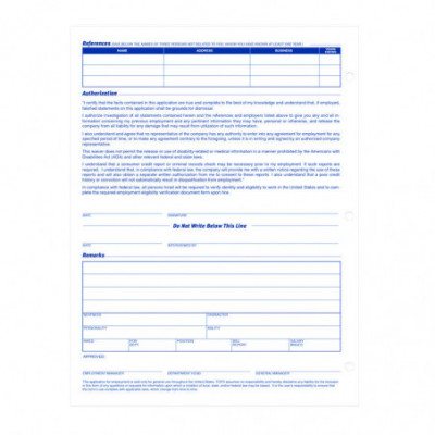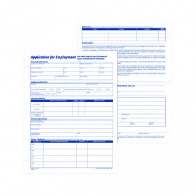 Get contact information, employment history and other information from applicants with these letter-size employment application forms. Make applying for employment simple. Each form is printed in English for convenience, while the three-hole-punched edge lets you conveniently insert them into any standard three-ring binder. These Adams® employment application forms comply with all legal requirements.