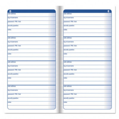 Keep all your user names, passwords and login hints in one place. Convenient pocket size allows you to always have the information at your disposal. Includes password safety tips and suggestions for creating stronger passwords. Alphabetically indexed. Removable label on front hides purpose of book.